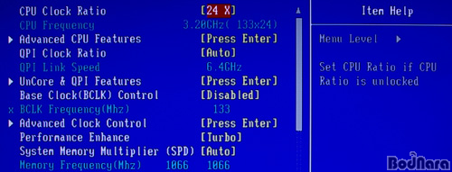 ¹è¼ö¸¦ ¶æÇÏ´Â CPU Clock RatioÀÇ °æ¿ì 12ºÎÅÍ 64±îÁö, Base ClockÀº 100MHzºÎÅÍ 600MHz±îÁö Á¶Àý °¡´ÉÇϸç, LGA 1366 ¼ÒÄÏÀÇ ³×ÇÒ·½ ºÒ·ëÇʵå ÇÁ·Î¼¼¼¿Í X58°£ÀÇ QPI ¸µÅ© ½ºÇǵå´Â QPI clock Ratio ¼³Á¤(Auto/ Slow Mode/ x36/ x44/ x48)À» ÅëÇØÁ¶Àý°¡´ÉÇÏ´Ù.