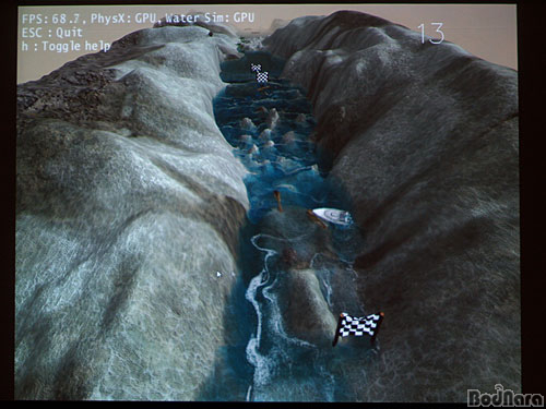 GPU PhysX¸¦ Áö¿øÇÏ´Â µ¥¸ð·Î º¸Æ®¸¦ Ÿ°í °À» °Å½½·¯ ¿Ã¶ó°¡´Â µµÁß ¹°ÀÇ Ç¥ÇöÀ̳ª ±ê¹ßÀÇ Ã³¸® ÁÖº¯ ¹°Ã¼ µîÀÇ º¯È¸¦ CPU·Î PhysX ¹°¸®¿£ÁøÀ» ó¸®ÇÑ ºÎºÐ°ú GPU·Î ó¸®Çϰí Àִ ȯ°æÀÇ Â÷À̸¦ º¸¿©ÁØ´Ù.