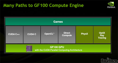 GF100Àº GT200À» ÀÌ¾î ´Ù¾çÇÑ GPGPU ÄÄÇ»ÆÃ ȯ°æÀ» Áö¿øÇϰí Àִµ¥ DirectX APIÀÇ DirectCompute¸¦ ºñ·ÔÇÏ¿© ¾ÖÇÃÀ» ÁÖÃàÀ¸·Î ÇÏ´Â °ø°³Ç¥ÁØ OpenCL, ±×¸®°í Àڻ簡 °³¹ßÇÑ CUDA C++/ CUDA C ¾ð¾î Áö¿ø, ±×¸®°í GPU·Î ¹°¸®¿¬»êÀ» µ½´Â PhysX »Ó¸¸ ¾Æ´Ï¶ó ±×µ¿¾È ó¸® ¼º´ÉÀÌ ºÎÁ·Çß´ø ½Ç½Ã°£ ±¤¿øÈ¿°ú µîÀ» °ÔÀÓÀ̳ª ¿µÈ µî¿¡ Àû¿ëÇÏ´Â OptiX Ray-Tracing (·¹ÀÌÆ®·¹À̽Ì) Áö¿øµµ °ÈµÇ°í ÀÖ´Ù.