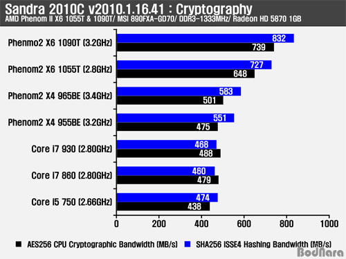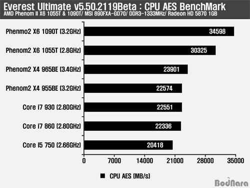 »êµå¶ó¿Í Everest¿¡ Æ÷ÇÔµÈ AES ¾ÏÈ£È ¿¬»ê º¥Ä¡¸¶Å©´Â AES-NI ¸í·É¾î¸¦ Áö¿øÇϴ Ŭ¶ôµ¥ÀÏ (Clarkdale) ÄÚ¾î i5/ i3 CPU³ª ÀÎÅÚ 6ÄÚ¾î ÄÚ¾î i7 980X¿¡¼ ³ôÀº ó¸® ¼º´ÉÀ» º¸¿©Áִµ¥ Å×½ºÆ®¿¡ »ç¿ëµÈ CPUµéÀº AES ¸í·É¾î¸¦ Áö¿øÇÏÁö ¸øÇØ CPU ¿¬»ê¿¡ ÀÇÁöÇØ CPU °£ÀÇ Ã³¸® ¼º´ÉÀ» ºñ±³ÇÒ ¼ö ÀÖ´Ù.