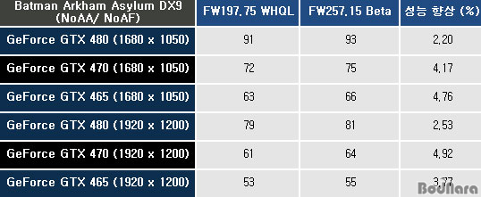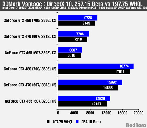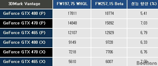 3DMark Vantage´Â 256 µå¶óÀ̹ö (257.15 Beta)¿Í ±âÁ¸ 197 µå¶óÀ̹ö (197.75 WHQL) µå¶óÀ̹ö¸¦ Àû¿ëÇÑ ¼º´ÉÀº 256 µå¶óÀ̹ö¿¡¼ Àü¹ÝÀûÀÎ ¼º´É Çâ»óÀÌ ÀÌ·ç¾îÁ³À¸¸ç, ¿£ºñµð¾Æ (NVIDIA)°¡ Á¦±âÇÑ ÃÖ´ë 5%ÀÇ ¼º´É Çâ»ó°ú ºñ±³ÇØ 5% ÀÌ»óÀÇ ¼º´É Çâ»óÀ» ³ªÅ¸³Â´Ù. °¡Àå ³ôÀº Çâ»óÀº ÆÛÆ÷¸Õ½º ÇÁ¸®¼Â (1280 x 1024, NoAA/ NoAF)¿¡¼´Â ÁöÆ÷½º GTX 470ÀÌ ÀͽºÆ®¸² ÇÁ¸®¼Â (1920 x 1200, 4xAA/ 16xAF)¿¡¼´Â ÁöÆ÷½º GTX 465ÀÇ ¼º´É Çâ»óÀÌ Å©°Ô ³ªÅ¸³´Ù.