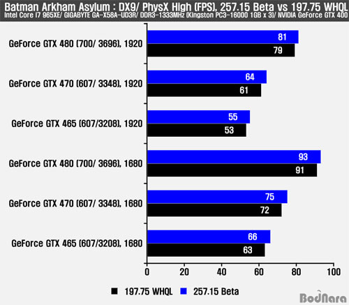 ¹èÆ®¸Ç ¾ÆÄ¯¼ö¿ë¼Ò´Â ¿£ºñµð¾ÆÀÇ PhysX ¹°¸®¿£ÁøÀ» Áö¿øÇϰí ÀÖ´Â °ÔÀÓÀ¸·Î PhysX High ¼³Á¤À» Àû¿ëÇØ Å×½ºÆ®¸¦ ÁøÇàÇß´Ù. Å×½ºÆ® °á°ú AA/ AF¸¦ Àû¿ëÇÏÁö ¾Ê¾ÒÀ» ¶§ ÃÖ´ë 5%¿¡ °¡±î¿î ¼º´É Çâ»óÀ» º¸¿´°í ÁöÆ÷½º GTX 465/ GTX 470ÀÇ Çâ»óÀÌ ´õ ³ô°Ô ³ªÅ¸³´Ù. ÀÌ´Â PhysX ó¸® ¼º´Éµµ ÇÔ²² Çâ»óµÈ °ÍÀ» È®ÀÎÇÒ ¼ö ÀÖ´Ù.
