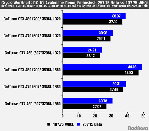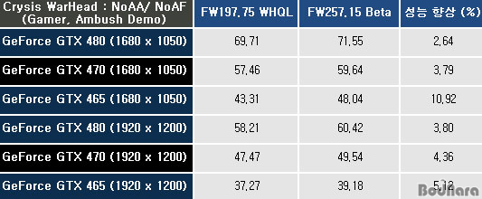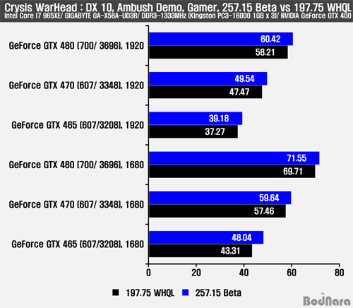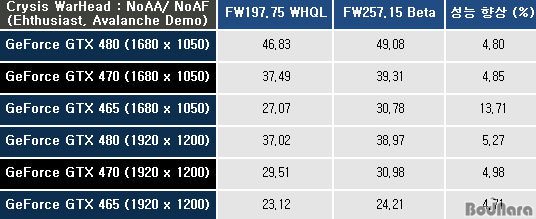 Crysis WarHead´Â Gamer ¼³Á¤°ú Ambush µ¥¸ð¿¡¼ ÃÖ´ë ¼º´É Çâ»óÀº ÁöÆ÷½º GTX 465°¡ °¡Àå ³ô°Ô ³ªÅ¸³µÀ¸¸ç, ÁöÆ÷½º GTX 480ÀÇ ¼º´É Çâ»óÀÌ °¡Àå ³·°Ô ³ªÅ¸³ª°í ÀÖ´Ù.
