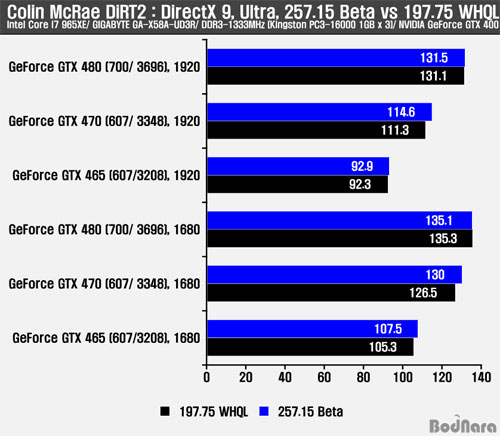 DirectX 9/ 11À» ¸ðµÎ Áö¿øÇϰí ÀÖ´Â Äݸ° ¸Æ·¹ÀÌ ´õÆ®2 (Colin McRae DiRT2)ÀÇ DirectX 9 ¸ðµå¿¡¼ÀÇ ¼º´É Çâ»óÀ» üũÇߴµ¥ ÀúÇØ»óµµÀÇ ÁöÆ÷½º GTX 480ÀÌ ¾à°£ ¶³¾îÁ³°í ³ª¸ÓÁö´Â ±Ù¼ÒÇϰųª 2% ³»¿ÜÀÇ ¼º´É Çâ»óÀÌ ÀÌ·ç¾îÁ³´Ù. ´õÆ®2 °ÔÀÓÀÇ °æ¿ì ¼º´É Çâ»ó¿¡ ³ªÅ¸³ªÁö ¾Ê¾Æ ¼º´ÉÀÌ Å©°Ô Çâ»óµÇÁö´Â ¾Ê°í ÀÖ´Ù.
