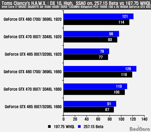 HAWX´Â DirectX 10 ȯ°æ¿¡¼ Å×½ºÆ®µÇ¾úÀ¸¸ç, ÀÌ °ÔÀÓ ¿ª½Ã 256 µå¶óÀ̹öÀÇ ¼º´É Çâ»óÀÌ Æ÷ÇÔµÇÁö ¾Ê¾Ò´Âµ¥ ÁöÆ÷½º GTX 480ÀÌ ¾à 6% ³»¿Ü·Î °¡Àå ³ôÀº Çâ»óÀ» º¸¿´À¸¸ç, ÁöÆ÷½º GTX 465´Â ÀúÇØ»óµµÀÇ Çâ»óÀÌ ´õ ³ô¾Ò´Ù.   AA/ AF¸¦ Àû¿ëÇÏÁö ¾ÊÀº »óȲ¿¡¼ÀÇ ¼º´É Çâ»óÀº Àü¹ÝÀûÀ¸·Î ÁöÆ÷½º GTX 480ÀÇ ¼º´É Çâ»óÀÌ ³ô°Ô ³ªÅ¸³µÀ¸¸ç, ÀϺΠ°ÔÀÓÀÇ °æ¿ì ÁöÆ÷½º GTX 465ÀÇ ¼º´É Çâ»óµµ ´«¿¡ ¶ç¾ú´Ù. |