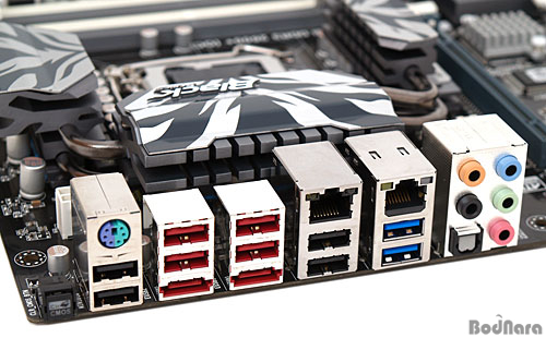 ¹éÆÐ³Î¿¡¼´Â CMOS¸¦ Æí¸®ÇÏ°Ô ÃʱâÈÇÒ ¼ö ÀÖ´Â Clear CMOS ½ºÀ§Ä¡¿Í eSATA3 (6Gbps) 2Æ÷Æ®, USB 3.0 2Æ÷Æ® (ÆÄ¶õ»ö), ±×¸®°í Optical SPDIF Ãâ·Â Æ÷Æ®¿Í 5Æ÷Æ® ¾Æ³¯·Î±× »ç¿îµå Æ÷Æ®, 8°³ÀÇ USB 2.0 (480Mbps) Æ÷Æ®¿Í µà¾ó ±â°¡ºñÆ® ÀÌ´õ³Ý Æ÷Æ®¸¦ Á¦°øÇÑ´Ù.