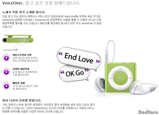 4¼¼´ë ¾ÆÀÌÆÌ ¼ÅÇÿ¡µµ 3¼¼´ë Á¦Ç°ºÎÅÍ Áö¿øÇÏ´ø º¸À̽º¿À¹ö(VoiceOver) ±â´ÉÀÌ ±×´ë·Î µé¾î°¬´Ù. ÀÌ ±â´ÉÀº ¾×Á¤ ȸéÀÌ ¾ø´Â ¼ÅÇÿ¡¼ À§ÂÊ¿¡ ´Þ¸° º¸À̽º¿À¹ö ¹öưÀ» ´©¸£¸é ÇöÀç Àç»ý ÁßÀÎ À½¾ÇÀÇ Á¦¸ñÀ̳ª ¾ÆÆ¼½ºÆ® À̸§, ´Ù¾çÇÑ Àç»ý¸ñ·Ï, ¹èÅ͸® »óÅ µîÀ» À½¼ºÀ¸·Î µé·ÁÁØ´Ù. ¼¼°è ¿©·¯ ³ª¶óÀÇ À½¾ÇÀ» Ç¥ÇöÇϱâ À§ÇØ 25°¡Áö ¾ð¾î¸¦ Áö¿øÇϸç, Çѱ¹¾îµµ Æ÷ÇԵȴÙ.
