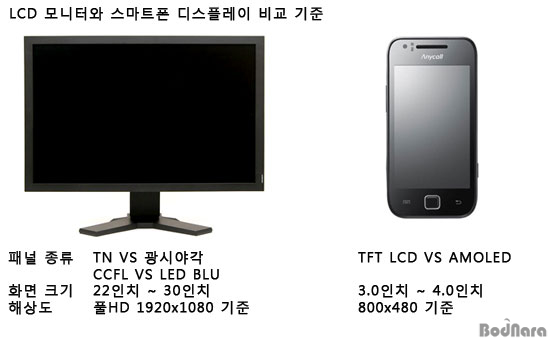 ÀÏ¹Ý LCD ¸ð´ÏÅͰ¡ TN ÆÐ³Î°ú ±¤½Ã¾ß°¢ ÆÐ³ÎÀÇ ½Ã¾ß°¢, ±×¸®°í CCFL(³ÃÀ½±ØÇü±¤·¥ÇÁ)°ú LED ¹é¶óÀÌÆ®ÀÇ ¼Òºñ Àü·Â, NTSC ±âÁØ »öÀçÇö·Â µîÀ¸·Î ÆÐ³Î µî±ÞÀ» ³ª´©´Â °Íó·³ ¾Èµå·ÎÀ̵åÆùµµ TFT LCD¿Í AMOELD ±â¼ú Áß ¾î¶² ÆÐ³ÎÀ» ½è´À³Ä¿¡ µû¶ó ´Þ¶óÁø´Ù.