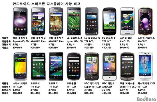 ±¹³» Ãâ½ÃµÈ 16Á¾ÀÇ ¾Èµå·ÎÀ̵åÆù µð½ºÇ÷¹ÀÌ »ç¾çÀ» ºñ±³Çغ¸¸é ´ëºÎºÐ 3.7ÀÎÄ¡ ȸé Å©±â, 800x480 ÇØ»óµµ¸¦ Áö¿øÇÏ¸ç ¸ÖÆ¼ ÅÍÄ¡ ±â´ÉÀ» °¡Áö°í ÀÖ´Ù. LG ¿ÉƼ¸Ó½º Q³ª HTC µðÀÚÀ̾î, ±¸±Û ³Ø¼½º¿øÃ³·³ óÀ½ Ãâ½ÃÇÒ ´ç½Ã¿Í ÇöÀç »ç¿ëµÇ´Â ÆÐ³Î Á¾·ù°¡ ´Þ¶óÁø Á¦Ç°Àº ÇöÀç Ãâ½ÃµÇ´Â Á¦Ç°ÀÇ ÆÐ³ÎÀ» ±âÁØÀ¸·Î Ç¥±âÇß´Ù.