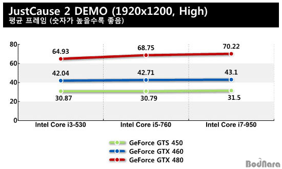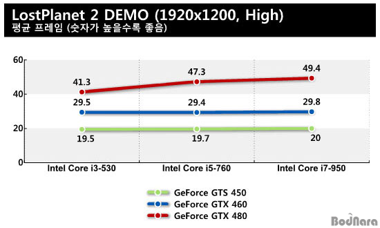 DX11À» Áö¿øÇÏ´Â ·Î½ºÆ®Ç÷¡´Ö2 µ¥¸ð º¥Ä¡¸¶Å©µµ ÁöÆ÷½º GTS 450À̳ª GTX 460¿¡¼´Â ÄÚ¾î i3-530°ú i5-760, i7-950ÀÇ Æò±Õ ÇÁ·¹ÀÓ Â÷À̰¡ ¾ø´Â °ÍÀ¸·Î ³ªÅ¸³´Ù. ¹Ý´ë·Î ÁöÆ÷½º GTX 480 ¼öÁØÀÇ Ç÷¡±×½Ê ±×·¡ÇÈ Ä«µå°¡ Á¦¼º´ÉÀ» º¸ÀÌ·Á¸é CPU¿Í ½Ã½ºÅÛ ¼º´Éµµ ±×¸¸Å ¹ÞÃÄÁà¾ß ÇÑ´Ù.