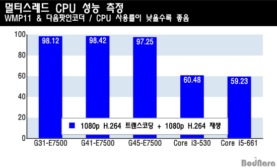 ¶ÇÇÑ ÇÏÀÌÆÛ½º·¹µù(HT) ±â¼ú žÀç·Î ³×ÀÌÆ¼ºê Äõµå Äھ´Ù´Â ¶³¾îÁöÁö¸¸ HT ¾øÀÌ µà¾ó Äھ µé¾î°£ ÄÚ¾î 2 µà¿À ÇÁ·Î¼¼¼¿¡ ºñÇØ ¸ÖƼ ÀÛ¾÷ ȯ°æ¿¡¼ ´õ ³ªÀº ¼º´ÉÀ» º¸¿©ÁØ´Ù. µ¿¿µ»ó ÀÎÄÚµùÀ» ÇÏ¸é¼ HD ¿µÈ¸¦ °¨»óÇÒ ¶§ ÄÚ¾î 2 µà¿À´Â 100% °¡±î¿î CPU »ç¿ë·üÀ» ±â·ÏÇÏÁö¸¸ ÄÚ¾î i3-530Àº À©µµ¿ì¿¡¼ HT¸¦ Áö¿øÇØ CPU Á¡À¯À²¿¡ ¿©À¯°¡ »ý±ä´Ù.