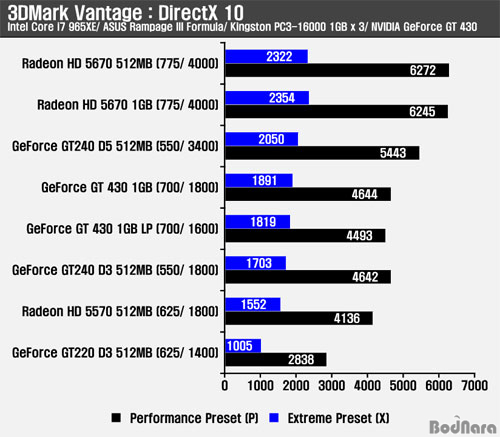 ±×·¡ÇÈÄ«µåÀÇ ±âº» ¼º´ÉÀ» ºñ±³ÇÒ ¼ö ÀÖ´Â 3DMark Vantage Å×½ºÆ® °á°ú ÁöÆ÷½º GT 430Àº 10¸¸¿ø ³»¿ÜÀÇ º¸±ÞÇü °æÀï Ä«µåµé°ú ºñ±³ÇØ ¶óµ¥¿Â HD 5570º¸´Ù ³ô°í HD 5670º¸´Ù´Â ³·Àº ½ºÄھ Á¦°øÇßÀ¸¸ç, ÁöÆ÷½º GT 240 D3 512MBº¸´Ù ³ôÀº ½ºÄھ Á¦°øÇÑ´Ù. ÀÌ¿¡ µû¶ó »óÀ§ Á¦Ç°µé°ú ¸¶Âù°¡Áö·Î ÀûÀýÇÑ °¡°ÝÀÌ °æÀï·ÂÀ» °áÁ¤ÇÒ °ÍÀ¸·Î ¿¹»óµÇ´Â ¸¸Å ÀûÀýÇÑ °¡°Ý´ë Çü¼ºÀÌ Áß¿äÇØ º¸ÀδÙ. Âü°í·Î Extreme PresetÀº 1920 x 1200, 4xAA/ 16xAF ¼³Á¤, Performance PresetÀº 1280 x 1024, 1xAA/ NoAF ¼³Á¤ÀÌ Àû¿ëµÈ´Ù. AA/ AF (Anti-Aliasing/ Anisotropic Filtering)