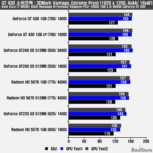 ÁöÆ÷½º GT 430ÀÇ ¹ß¿Àº Àü¹ÝÀûÀ¸·Î ¶óµ¥¿Â °è¿º¸´Ù ³ô¾Ò´Âµ¥ À̴ Ŭ·°ÀÇ ¿µÇâ°ú ÀÛÀº Å©±âÀÇ Ä𸵠¼Ö·ç¼Ç ¿ª½Ã ¿µÇâÀ» ÁÖ´Â °ÍÀ¸·Î º¸¿©Áø´Ù. ÁöÆ÷½º GT 430ÀÇ ¿¼³°è Àü·ÂÀº 49W, HD 5670Àº 61W, HD 5570Àº 42.7W, GT 240Àº 69W, GT 220Àº 58W TDP·Î È®ÀεǾúÀ¸³ª ÁöÆ÷½º GTX 460 ½Ã¸®Á ÁöÆ÷½º GTS 450ÀÇ °á°ú¿Í °°ÀÌ ÁöÆ÷½º GT 240 D5¿Í °ÅÀÇ °°Àº Àüü ½Ã½ºÅÛ ¼ÒºñÀü·ÂÀÌ ÃøÁ¤µÇ¾úÀ¸¸ç, ¶óµ¥¿Â HD 5670/ HD 5570º¸´Ù Àü¹ÝÀûÀ¸·Î ³ôÀº ¼ÒºñÀü·ÂÀ» Á¦°øÇÏ´Â °ÍÀ¸·Î È®ÀεȴÙ.