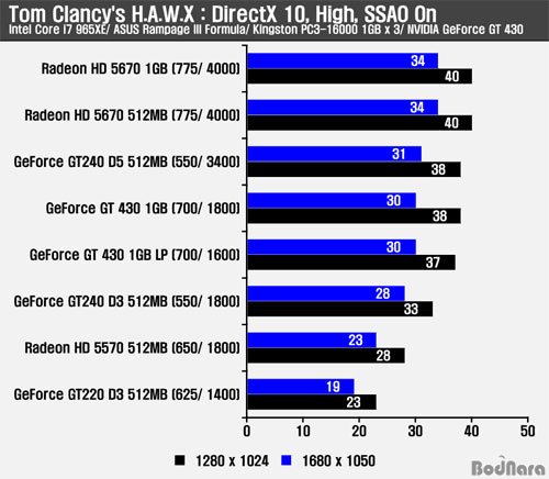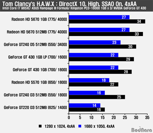 HAWX °ÔÀÓ¿¡¼´Â ÁöÆ÷½º GT 240 D5 512MBº¸´Ù ³·Àº ½ºÄھ Á¦°øÇßÀ¸¸ç, HD 5570Àº ¿ì¼¼, HD 5670¿¡´Â ¹Ð·ÈÀ¸¸ç, ÁöÆ÷½º GT 220À̳ª GT 240 D3 512MB¸¦ ¾Õ¼¹´Ù.
