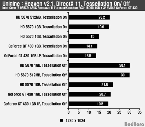 DX11°ú Å×¼¿·¹ÀÌ¼Ç (tessellation) ¼º´ÉÀº Å×¼¿·¹ÀÌÅÍ À¯´ÖÀ» ´õ ¸¹ÀÌ Æ÷ÇÔÇϰí ó¸® ¼º´ÉÀ» °³¼±ÇÑ Æä¸£¹Ì (Fermi) ¾ÆÅ°ÅØÃ³ Á¦Ç°±ºÀÌ ¿ì¼öÇߴµ¥ Äݸ° ¸Æ·¹ÀÌ ´õÆ®2 °ÔÀÓ¿¡¼ ÁöÆ÷½º GT 430Àº 2°³·Î ÁÙ¾îµç Å×¼¿·¹ÀÌÅÍ¿Í ±¸Á¶ÀûÀÎ ÇѰè·Î ¶óµ¥¿Â HD 5570À» ¾Õ¼¹Áö¸¸, HD 5670¿¡´Â ¶³¾îÁö´Â ó¸® ¼º´ÉÀ» º¸¿© Æä¸£¹Ì ±â¹Ý Ä«µåÀÇ ÀåÁ¡À» »ì¸®Áö ¸øÇß´Ù.