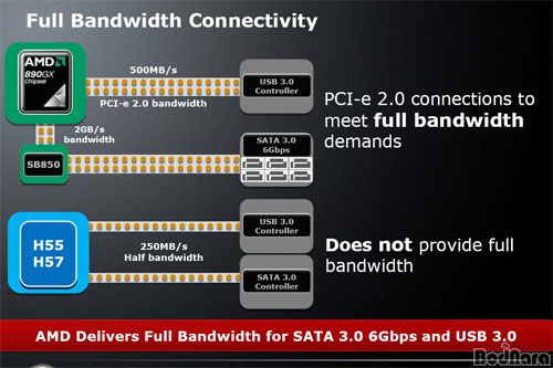 ¹Ý¸é, º°µµÀÇ SATA 6Gbps ÄÁÆ®·Ñ·¯¸¦ »ç¿ëÇÒ Çʿ䰡 ¾ø´Â AMD SB800 ½Ã¸®Áî´Â º°µµ ÄÁÆ®·Ñ·¯¸¦ À§ÇÑ PCIe Lane È®º¸°¡ ÇÊ¿ä¾ø±â ¶§¹®¿¡ ±â´É È®Àå¿¡ À¯¸®Çϸç, SATA 6Gbps¸¦ ³×ÀÌÆ¼ºê Áö¿øÇÏ´Â IntelÀÇ ¸ÞÀνºÆ®¸² 6 ½Ã¸®Áî Ĩ¼ÂÀÎ P67/H67ÀÌ 2°³ÀÇ SATA 6Gbps Æ÷Æ®¸¸À» Á¦°øÇØ 6°³ÀÇ SATA 6Gbps Æ÷Æ®¸¦ Á¦°øÇÏ´Â AMD ½Ã½ºÅÛÀÌ SATA 6Gbps ȯ°æ¿¡¼´Â °æÀï»ç º¸´Ù À¯¸®ÇÑ ÀÔÀåÀÌ´Ù.