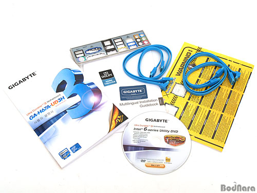 »ùÇÿ¡ Á¦°øµÈ ºÎ¼Ó¹°Àº »ç¿ëÀÚ ¸Å´º¾ó 1ºÎ¿Í ¸ÖƼ·©±ÍÁö ÀνºÅç °¡À̵åºÏ 1ºÎ, Àü¿ë I/O ½¯µå, µå¶óÀ̹ö ¹× À¯Æ¿¸®Æ¼ DVD 1Àå, SATA ÄÉÀ̺í 4°³, Dolby Home Theater ·Î°í ½ºÆ¼Ä¿¿Í GIGABYTE ·Î°í ½ºÆ¼Ä¿, CPU ¼ÒÄÏ ¼³Ä¡ ÁÖÀÇ °¡À̵å 1ÀåÀÌ Á¦°øµÈ´Ù. ¶ÇÇÑ, À̹ÌÁö¿¡ Æ÷ÇÔµÇÁö ¾Ê¾ÒÀ¸³ª ¹éÆÐ³Î D-SUB/ DVI/ HDMI/ DisplayPort Æ÷Æ® ÇÃ¶ó½ºÆ½ Ä¿³ØÅÍ Ä¿¹ö°¡ ¸ÞÀκ¸µå¿¡ ÀåÂøµÇ¾î ÀÖ´Ù.