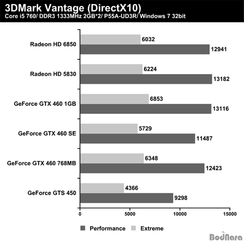 À©µµ¿ì ºñ½ºÅ¸¿¡¼ Áö¿øÇÏ´Â DirectX 10 ȯ°æ¿¡¼ÀÇ ¼º´ÉÀ» Å×½ºÆ®ÇÏ´Â 3DMark Vantage¿¡¼ ÁöÆ÷½º GTX 460 SE´Â ÁöÆ÷½º GTX 460 768MBÀÇ ¾à 90% °¡·®ÀÇ ¼º´ÉÀ» º¸À̸ç, °æÀï»çÀÇ ¶óµ¥¿Â HD 5830°ú HD 6850º¸´Ùµµ ³·Àº ¼º´ÉÀ» º¸ÀδÙ. ÀÌ´Â ÁÙ¾îµç CUDA ÄÚ¾î¿Í ³·¾ÆÁø µ¿ÀÛ Å¬·°ÀÇ ¿µÇâÀ¸·Î º¸À̸ç, GTX 460 768MB¿Í ºñ±³ÇÑ GTX 460 SEÀÇ ¼º´É Â÷ÀÌ´Â 4xAA¿Í 16xAF°¡ Àû¿ëµÈ Extreme(90.25%) ÇÁ¸®¼Â Å×½ºÆ®ÀÇ °æ¿ì, 1xAA¿Í 1xAF ¼³Á¤ÀÎ Performance(92.46%) ÇÁ¸®¼Â º¸´Ù ¼º´É °ÝÂ÷°¡ ÁÙ¾îµç ¸ð½ÀÀ» º¸ÀδÙ.