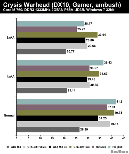 2008³â ¹ß¸ÅµÈ °ÔÀÓÀÌÁö¸¸ ¾ÆÁ÷±îÁöµµ °í»ç¾ç °ÔÀÓÀ¸·Î ¼Õ²ÅÈ÷´Â Å©¶óÀ̽ýº ¿öÇìµåÀÇ º¥Ä¡¸¶Å©¸¦ ÅëÇØ È®ÀÎÇÑ ¼º´ÉÀº ¾Õ¼± µÎ °ÔÀÓ°ú ¸¶Âù°¡Áö·Î ¿©Å¸ GTX 460 2Á¾À» ºñ·ÔÇØ °æÀï Á¦Ç°º¸´Ù ³·Àº ¸ð½ÀÀ» º¸¿©ÁØ´Ù. ¹Ý¸é, 4xAA¸¦ ÅëÇØ °íǰÁú ȸéÀ» ±¸ÇöÇßÀ» ¶§´Â GTX 460 768MB¿Í °ÅÀÇ ±ÙÁ¢ÇÑ ¼º´ÉÀ» º¸¿©ÁÖ°í ÀÖÀ¸¸ç, 8xAA¿¡¼´Â °æÀï»çÀÇ µÎ Á¦Ç°À» ´É°¡ÇÏ´Â ¼º´ÉÀ» º¸À̱⵵ ÇÑ´Ù.   |