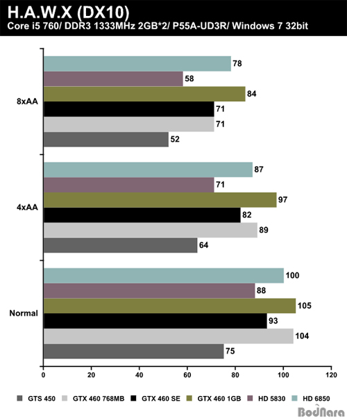 H.A.W.XÀÇ °æ¿ì¿¡¼µµ AA ¼³Á¤À» ÁÖÁö ¾Ê¾ÒÀ» ¶§´Â GTX 460 SE¿Í GTX 460 768MB ¹öÀüÀÇ ¼º´É Â÷À̰¡ Æò±Õ 10ÇÁ·¹ÀÓ ÀÌ»ó ¹ß»ýÇϳª, AA ¼³Á¤À» ÅëÇØ ±×·¡ÇÈ ºÎÇϰ¡ Ä¿Áö¸é ±× Â÷À̰¡ ÁÙ¾îµé°í, 8xAA¸¦ Àû¿ëÇßÀ» °æ¿ì µ¿ÀÏÇÑ ¼º´ÉÀ» º¸¿©ÁØ´Ù. ¶ÇÇÑ, GTX 460 SE´Â H.A.W.X¿¡¼ HD 5830º¸´Ù ³ôÀº ¼º´ÉÀ» üÇèÇÒ ¼ö Àִµ¥, ±× Â÷ÀÌ´Â ³ôÀº AA¸¦ ¼³Á¤ÇÒ¼ö·Ï ±× Â÷À̰¡ Ä¿Áö´Â °ÍÀ» ¾Ë ¼ö ÀÖ´Ù.