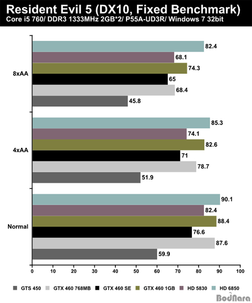 Resident Evil5(DX10)ÀÇ °æ¿ì¿¡¼µµ ÁöÆ÷½º GTX 460 SE´Â ÁöÆ÷½º GTX 460 768MB¹öÀüÀ» ºñ·ÔÇÑ °æÀï Á¦Ç°º¸´Ù ³·Àº ¼º´ÉÀ» º¸À̳ª, AA ¼³Á¤ÀÌ ³ô¾ÆÁú¼ö·Ï ÁöÆ÷½º GTX 460 768MB¿¡ ±ÙÁ¢ÇÑ ¼º´ÉÀ» º¸¿©ÁØ´Ù.