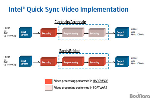 Ŭ¶ôµ¥ÀÏ (Clarkdale)°ú ¾Æ·»µ¥ÀÏ (Arrandale)Àº Preprocessing°ú Encoding ÇÁ·Î¼¼½Ì ºÎºÐÀ» ¼ÒÇÁÆ®¿þ¾î °¡¼ÓÀ¸·Î Áö¿øÇßÁö¸¸, »÷µðºê¸´Áö´Â Çϵå¿þ¾î °¡¼ÓÀ» Áö¿øÇϰí ÀÖ´Ù. Äü½ÌÅ© ºñµð¿À ±â¼úÀº ¿µ»óÀÇ Çϵå¿þ¾î µðÄÚµù ¿Ü¿¡µµ ÀÎÄÚµù °úÁ¤¿¡¼ À̸¦ Áö¿øÇÒ °æ¿ì ¼ÒÇÁÆ®¿þ¾î·Î¸¸ ÀÎÄÚµùÇÏ´ø °Íº¸´Ù 2¹è ºü¸¥ ¼º´ÉÀ» Á¦°øÇÒ ¼ö ÀÖ´Â °ÍÀ¸·Î ¾Ë·ÁÁö°í ÀÖ´Ù.