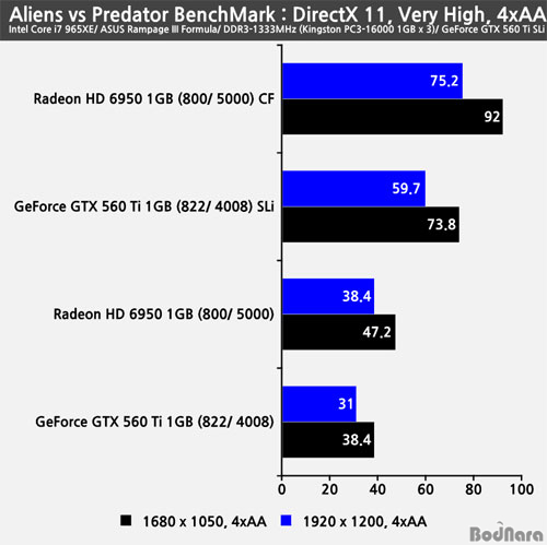 ¿¡À̸®¾ð ´ë ÇÁ·¹µ¥ÅÍ (Aliens vs Predator) º¥Ä¡¸¶Å©´Â 4xAAÀÇ ÇÊÅ͸µÀ» Àû¿ëÇÏÁö ¾Ê¾Ò´ø ȯ°æ°ú ¸¶Âù°¡Áö·Î ¶óµ¥¿Â HD 6950 1GB°¡ ³ôÀº ÇÁ·¹ÀÓÀ» Á¦°øÇß°í ´ÜÀÏ Ä«µå ¼º´Éº¸´Ù ¸ÖƼ GPU ¼º´É¿¡¼ ±× Â÷À̰¡ ´õ ¶Ñ·ÇÇÏ°Ô ³ªÅ¸³µ´Ù.
