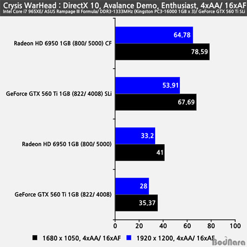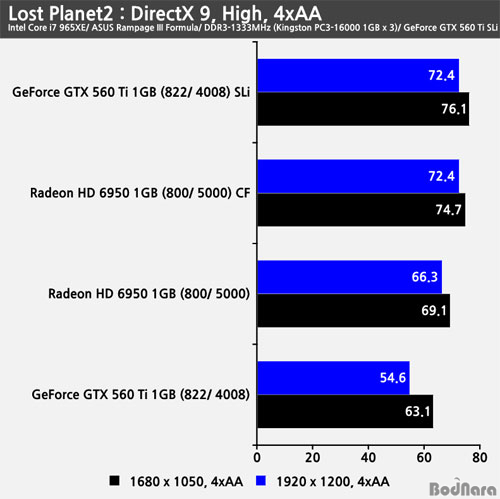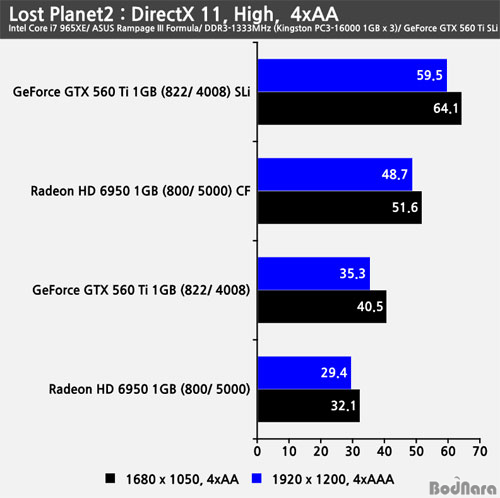 À̹ø¿¡´Â ÁöÆ÷½º GTX 560 Ti¿Í ¶óµ¥¿Â HD 6950 1GBÀÇ ´ÜÀÏ Ä«µå ¹× ¸ÖƼ GPU (NVIDIA SLi vs AMD CrossFire X) ±¸¼º½Ã 4xAA/ 16xAF, 4xAA/ 8xAAÀÇ