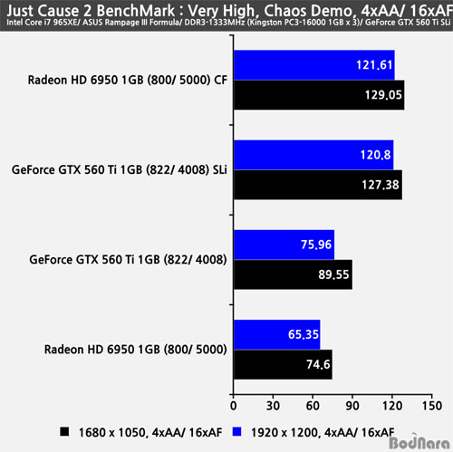 Àú½ºÆ®ÄÚÁî2 (Just Cause 2) º¥Ä¡¸¶Å©¿¡ 4xAA/ 16xAF¸¦ Àû¿ëÇÑ °á°ú´Â ´ÜÀÏ Ä«µå¿¡¼´Â ¾à 10fps ³»¿ÜÀÇ Â÷ÀÌ·Î ÁöÆ÷½º GTX 560 Ti°¡ À¯¸®ÇÑ °ÍÀ¸·Î È®ÀεǸç, ¸ÖƼ GPU ȯ°æÀº ¹Ý´ë·Î ¶óµ¥¿Â HD 6950 1GB°¡ ±Ù¼ÒÇÑ Â÷ÀÌ·Î ¾Õ¼°í ÀÖÀ¸³ª ±× Â÷ÀÌ´Â ´ÜÀÏ Ä«µå ȯ°æº¸´Ù ³ô°Ô ³ªÅ¸³ªÁö ¸øÇß´Ù.