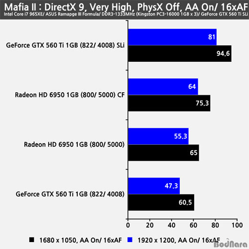 ¸¶ÇǾÆ2 (Mafia II) °ÔÀÓÀº ´ÜÀÏÀº ¶óµ¥¿Â HD 6950 1GB°¡, ¸ÖƼ GPU ±¸¼º¿¡¼´Â ÁöÆ÷½º GTX 560 Ti SLi°¡ À¯¸®ÇÑ °ÍÀ¸·Î ³ªÅ¸³´À¸¸ç, ¸ÖƼ GPU ±¸¼ºÀÇ ÇÁ·¹ÀÓ Â÷ÀÌ´Â ´ÜÀÏ Ä«µå¿¡¼ÀÇ ÇÁ·¹ÀÓº¸´Ù ±× Â÷À̰¡ ´õ ³ô°Ô ³ªÅ¸³ª°í ÀÖ´Ù.