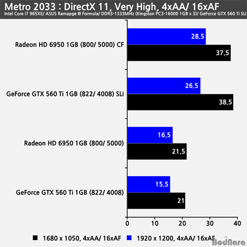¸ÞÆ®·Î 2033 (Metro 2033)Àº DX11 ȯ°æ¿¡¼ 4xAA/ 16xAFÀÇ ÇÊÅ͸µÀ» Àû¿ëÇÏÁö ¾Ê¾Ò´ø »óȲ°ú ¸¶Âù°¡Áö·Î ¶óµ¥¿Â HD 6950 1GB°¡ À¯¸®ÇÑ °ÍÀ¸·Î ³ªÅ¸³µ´Ù. ´ÜÀϰú ¸ÖƼ GPU ±¸¼º ȯ°æ ¸ðµÎ ÇÁ·¹ÀÓÀÇ Â÷ÀÌ´Â Å©°Ô ³ªÅ¸³ªÁö´Â ¸øÇß´Ù.