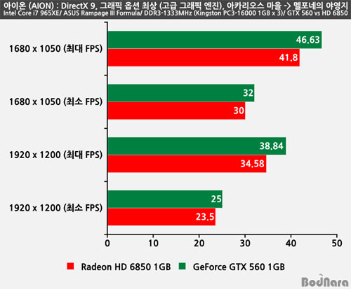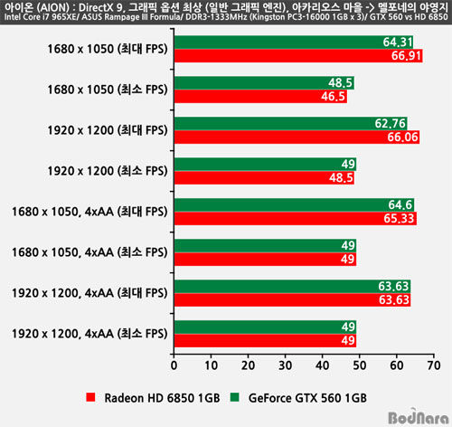 Å×½ºÆ®´Â ¾ÆÀÌ¿ÂÀÌ Á¦°øÇÏ´Â 2°¡Áö ±×·¡ÇÈ ¿£ÁøÀ» ¸ðµÎ °í·ÁÇßÀ¸¸ç, ÀÏ¹Ý ±×·¡ÇÈ ¿£Áø¿¡¼´Â AA Àû¿ë ¹× ¹ÌÀû¿ë ¸ðµÎ ±×·¡ÇÈÄ«µåº° ¼º´ÉÀº ¶óµ¥¿Â HD 6850ÀÌ ÃÖ´ë ÇÁ·¹ÀÓ¿¡¼ ±Ù¼ÒÇÏ°Ô À¯¸®ÇÑ °ÍÀ¸·Î È®ÀεȴÙ. ¹Ý¸é, °í±Þ ±×·¡ÇÈ ¿£Áø ¼±Åýÿ¡´Â ±×·¡ÇÈ Ä«µå 󸮷®ÀÌ ´Ã¾î³ª ±×·¡ÇÈ Ä«µå °£ÀÇ ¼º´É Â÷ÀÌ ºñ±³°¡ ´õ ¿ëÀÌÇØÁ³°í ÀÌ ¶§´Â ¾Õ¼¿Í ¹Ý´ë·Î ÃÖ¼Ò¿Í ÃÖ´ë ÇÁ·¹ÀÓ ¸ðµÎ ÁöÆ÷½º GTX 560ÀÌ À¯¸®Çß´Ù.