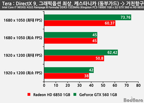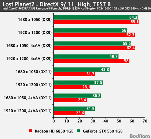 ·Î½ºÆ®Ç÷¡´ÖÀº DirectX 9¿Í DirectX 11 ȯ°æÀ» ¸ðµÎ Å×½ºÆ®ÇÒ ¼ö ÀÖÀ¸¸ç, ¿£ºñµð¾Æ (NVIDIA) ±×·¡ÇÈÄ«µå¿¡ º¸´Ù ÃÖÀûÈµÈ °ÔÀÓÀ¸·Î ¾Ë·ÁÁ® ÀÖ´Ù. DirectX 9 ȯ°æ¿¡¼´Â Æä¸£¹Ì (Fermi) ¾ÆÅ°ÅØÃ³ÀÇ ÁöÆ÷½º GTX 560ÀÌ ´Ù¼Ò ¹Ð¸®´Â ¸ð½ÀÀ» º¸¿©ÁÖ°í ÀÖ´Ù. ±×·¯³ª, ¹Ý´ë·Î DirectX 11°ú Å×¼¿·¹À̼ÇÀÇ ÀüȯÀ» °Á¶ÇÑ Æä¸£¹Ì °è¿ Ä«µå´ä°Ô °æÀï Á¦Ç°ÀÎ ¶óµ¥¿Â HD 6850À» Á¦Ä¡¸ç ³ôÀº ÇÁ·¹ÀÓÀ» Á¦°øÇß´Ù.