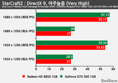 ÇØ»óµµº° °¢ Á¦Ç°ÀÇ ÇÁ·¹ÀÓ Â÷ÀÌ´Â 2fps ³»¿Ü·Î Å©°Ô ³ªÅ¸³ªÁö ¸øÇßÀ¸¸ç, ÁöÆ÷½º GTX 560ÀÌ ¶óµ¥¿Â HD 6850°ú ºñ±³ÇØ Àü¹ÝÀûÀ¸·Î 3.6% °¡·® ´õ ³ôÀº ¼º´ÉÀ» Á¦°øÇÑ´Ù. ½ºÅ¸Å©·¡ÇÁÆ®2´Â ÆÛÆ÷¸Õ½º±Þ µÎ Á¦Ç° Å×½ºÆ® °á°ú ÁöÆ÷½º GTX 560À̳ª ¶óµ¥¿Â HD 6850 µÑ Áß ¾î¶² °ÍÀ» »ç¿ëÇÏ´õ¶óµµ Å« ÆøÀÇ ¼º´É Â÷ÀÌ´Â ¹ß»ýµÇÁö ¾Ê´Â °ÍÀ¸·Î È®ÀεȴÙ. ´Ù¸¸, ÃÖ¾ÇÀÇ »óȲÀ» °í·ÁÇÑ ÃÖ¼Ò ÇÁ·¹ÀÓÀº ¾ÆÀ̿°ú ¸¶Âù°¡Áö·Î ÁöÆ÷½º GTX 560ÀÌ ±Ù¼ÒÇÏ°Ô À¯¸®Çß´Ù.