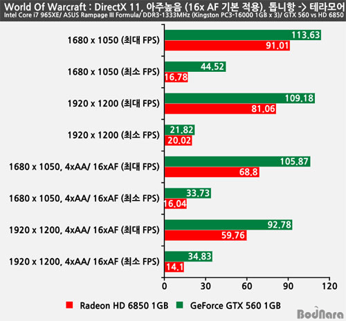 DirectX 11°ú Å×¼¿·¹ÀÌ¼Ç Ã³¸®´Â ¶óµ¥¿Â HD 6800 ½Ã¸®Áî¿¡¼ ¶óµ¥¿Â HD 5800 ½Ã¸®Á´Ù °³¼±ÀÌ ÀÌ·ç¾îÁ³À¸³ª ÁöÆ÷½º GTX 560Àº Æä¸£¹Ì (Fermi) ±â¹ÝÀ¸·Î ¿©ÀüÈ÷ ÀÌ ºÎºÐÀÇ Ã³¸® ¼º´ÉÀÌ À¯¸®Çѵ¥ Å×½ºÆ® ÇØ»óµµ ¸ðµÎ ÁöÆ÷½º GTX 560ÀÌ À¯¸®ÇÏ°Ô ³ªÅ¸³µ´Ù. ÃÖ¼Ò ÇÁ·¹ÀÓÀº ´Ù¸¥ ¿Â¶óÀÎ °ÔÀÓµé°ú ¸¶Âù°¡Áö·Î ÁöÆ÷½º GTX 560ÀÌ À¯ÁöÀ²ÀÌ ³ô¾ÒÀ¸¸ç, AA/ AF¿Í ÇØ»óµµ°¡ ³ô¾ÆÁú¼ö·Ï ÁöÆ÷½º GTX 560Àº ¶óµ¥¿Â HD 6850º¸´Ù À¯¸®ÇÏ°Ô ³ªÅ¸³ª ¿ùµå ¿Àºê ¿öÅ©·¡ÇÁÆ®¸¦ °í·ÁÇÏ´Â »ç¿ëÀÚµéÀ̶ó¸é, ÁöÆ÷½º GTX 560ÀÌ ´õ À¯¸®ÇØ º¸ÀδÙ.