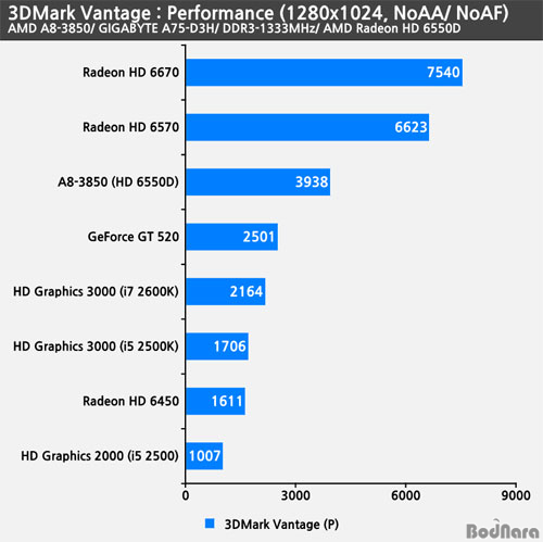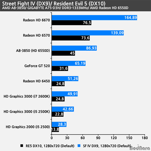 °ÔÀÌ¹Ö È¯°æ¿¡¼´Â ÀÎÅÚ »÷µðºê¸´Áö (Sandy Bridge)¿¡ ³»ÀåµÈ HD Graphics 2000/ 3000 ±×·¡ÇȺ¸´Ù AMDÀÇ A ½Ã¸®Áî APU¿¡ ³»ÀåµÈ ±×·¡ÇÈÄÚ¾îÀÇ Ã³¸® ¼º´ÉÀÌ Àü¹ÝÀûÀ¸·Î ¿ì¼öÇÑ °ÍÀ¸·Î È®ÀεȴÙ. º¸±ÞÇü DX11 Áö¿ø ÁöÆ÷½º GT 520À̳ª ¶óµ¥¿Â HD 6450 ¿ÜÀåÇü ±×·¡ÇÈÄ«µå¸¦ ¾Õ¼¹°í ¶óµ¥¿Â HD 6570 (Turks)¿¡´Â ºÎÁ·ÇÑ Ã³¸® ¼º´ÉÀ» Á¦°øÇߴµ¥ ÀÌ´Â º°µµÀÇ ¸Þ¸ð¸®¿Í 128bit ¸Þ¸ð¸® ÀÎÅÍÆäÀ̽º, 480SP, 24 ÅØ½ºÃ³ À¯´Ö, 8 ROP ±¸¼ºº¸´Ù ½ºÆå»óÀ¸·Î ºÒ¸®Çϱ⠶§¹®ÀÌ´Ù. ƯÈ÷, ¸Þ¸ð¸®´Â ½Ã½ºÅÛ ¸Þ¸ð¸®¸¦ °øÀ¯ÇϹǷΠ½Ã½ºÅÛ ¸Þ¸ð¸® µ¿ÀÛ Å¬·°¿¡ µû¶ó ³»Àå ±×·¡ÇÈÀÎ ¶óµ¥¿Â HD 6550DÀÇ ¼º´É¿¡ ¿µÇâÀ» ÁØ´Ù.