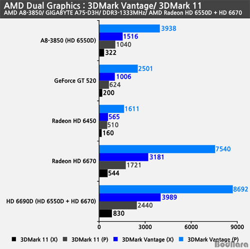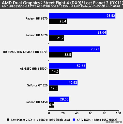 AMD µà¾ó ±×·¡ÇȽº (Dual Graphics)¸¦ ¶óµ¥¿Â HD 6550D¿Í HD 6670À¸·Î ±¸¼ºÇÒ °æ¿ì ³»Àå ±×·¡ÇÈ ´Üµ¶À¸·Î µ¿ÀÛÇÒ ¶§º¸´Ù Çâ»óµÈ 3D ¼º´ÉÀ» ¾òÀ» ¼ö ÀÖ´Ù. °ÔÀÓÀÇ ÃÖÀûÈ¿¡ µû¶ó 3DMark ½Ã¸®Áî´Â µà¾ó ±×·¡ÇȽºÀÌ Çâ»óÀÌ ³ªÅ¸³µ°í ½ºÆ®¸®Æ®ÆÄÀÌÅÍ4ÀÇ °æ¿ì¿¡´Â ´Üµ¶º¸´Ù Çâ»óµÇ³ª »óÀ§ ¹öÀüµéº¸´Ù Å©°Ô Çâ»óµÇÁö ¸øÇß´Ù. ·Î½ºÆ® Ç÷¡´Ö 2 (Lost Planet 2)ÀÇ DX11 ¸ðµå¿¡¼´Â ÇÁ·¹ÀÓÀÇ Çâ»óÀÌ »óÀ§ Á¦Ç°µéÀ» ³Ñ¾î¼ °ÔÀÓÀÇ ÃÖÀûȰ¡ ±×¸¸Å Áß¿äÇØ º¸ÀδÙ.