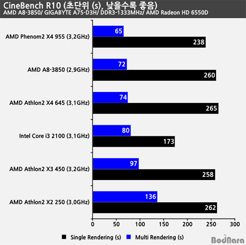 ¸ÖƼÄÚ¾î CPU Ȱ¿ëÀÌ ³ô¾ÆÁö´Â CPU ·»´õ¸µ ¼º´ÉÀ» CineBench R10À¸·Î ÁøÇàÇÑ °á°ú ½Ì±Û ·»´õ¸µ ¼º´ÉÀº CPUÀÇ ¿¬»ê ¼º´É°ú IPC ó¸® ¼º´É, °íŬ·°¿¡ ¿µÇâÀ» ¹Þ´Â ¸¸Å À̹ø¿¡µµ ÄÚ¾î i3 2100ÀÌ À¯¸®Çß´Ù. ¹Ý¸é, ¸ÖƼÄÚ¾î CPU°¡ Ȱ¿ëµÇ´Â ¸ÖƼ ·»´õ¸µ ȯ°æ¿¡¼´Â ÄÚ¾î ¼ö°¡ ¸¹Àº AMD A8-3850À» ºñ·ÔÇÑ ÄõµåÄÚ¾î CPUµéÀÌ À¯¸®ÇÑ °ÍÀ¸·Î È®ÀεȴÙ. A8-3850Àº IPC ¼ÒÆø °³¼±°ú ³»ºÎ ó¸® °³¼±À¸·Î CPU ·»´õ¸µ½Ã 200MHz ´õ ³ôÀº ¾Ö½½·Ð2 X4 645 (3.1GHz)º¸´Ù ±Ù¼ÒÇÏ°Ô ³ôÀº ó¸® ¼º´ÉÀ» Á¦°øÇß´Ù.