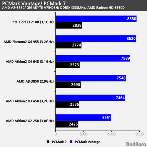 Àüü ½Ã½ºÅÛÀÇ ¼º´ÉÀ» ÃøÁ¤ÇÒ ¼ö ÀÖ´Â PCMark Vantage¿Í PCMark 7À» ÀÌ¿ëÇØ CPU °£ÀÇ ½Ã½ºÅÛ ¼º´ÉÀ» ºñ±³Çß´Ù. ¸ÖƼÄÚ¾î CPU¸¦ ¹Ý¿µÇϰí ÀÖÀ¸³ª AMD °è¿º¸´Ù ÀÎÅÚ »÷µðºê¸´Áö (Sandy Bridge) ±â¹ÝÀÇ ÄÚ¾î i3 2100ÀÌ µà¾óÄÚ¾î CPUÁö¸¸, °íŬ·°À» ¹ÙÅÁÀ¸·Î Àü¹ÝÀûÀ¸·Î ³ôÀº ½Ã½ºÅÛ ¼º´ÉÀ» Á¦°øÇß´Ù.