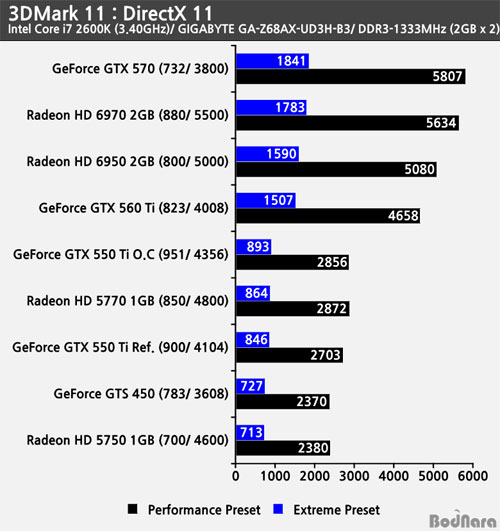 ÁöÆ÷½º GTS 450Àº ¶óµ¥¿Â HD 5750 ¶Ç´Â ¶óµ¥¿Â HD 6750, ÁöÆ÷½º GTX 550 Ti´Â ¶óµ¥¿Â HD 5770 ¶Ç´Â HD 6770°ú °æÀïÇϸç, ÁöÆ÷½º GTX 560 Ti´Â ¶óµ¥¿Â HD 6950 1GB, ÁöÆ÷½º GTX 570Àº ¶óµ¥¿Â HD 6970°ú HD 6950 »çÀÌÀÇ ¼º´ÉÀ» Á¦°øÇÑ´Ù.