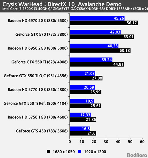 À̹ø¿¡´Â DirectX 10À» Áö¿øÇÏ´Â ½ÇÁ¦ °ÔÀÓÀÎ Crysis WarHead¸¦ ÀÌ¿ëÇØ ¼º´ÉÀ» ºñ±³Çߴµ¥ DirectX 11°ú ´Þ¸® Á¦Ç°µéÀÇ Æ¯¼º°ú ¸®¾ð¾÷¿¡ µû¶ó ´Ù¸¥ ¼º´ÉÀ» º¸¿©ÁÖ¾ú´Ù. ¾ç»çÀÇ µ¿±Þ ¶óÀξ÷ Á¦Ç°µé »çÀÌ´Â ÇÁ·¹ÀÓÀÇ Â÷À̰¡ ´«¿¡ ¶é Á¤µµ·Î ³ªÅ¸³ªÁö ¾Ê°í ¼·Î ¾ùºñ½ÁÇÑ ¼º´ÉÀ» Á¦°øÇß´Ù. ¿À¹öŬ·°µÈ Á¦Æ®¿þÀÌ ÁöÆ÷½º GTX 550 Ti O.C´Â ·¹ÆÛ·±½ºº¸´Ù °æÀï ¶óµ¥¿Â HD 5770º¸´Ù ±Ù¼ÒÇÏ°Ô ¾Õ¼± ÇÁ·¹ÀÓÀ» Á¦°øÇÑ´Ù.