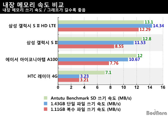 ¾ÆÀÌÄڴϾÆÅÇ A100ÀÇ ³»Àå ¸Þ¸ð¸® ¼Óµµ´Â 1.43GBÀÇ µ¿¿µ»ó ÆÄÀÏÀ» º¹»çÇϴµ¥ °É¸° ½Ã°£ÀÌ ¾à 2ºÐ 14ÃÊ, ÀÛÀº ¿ë·®ÀÇ ¿©·¯ ÆÄÀϵé 1.11GB¸¦ º¹»çÇϴµ¥ 2ºÐ 23ÃÊ °¡·® ¼Ò¿äµÇ¾ú´Ù. ÀÌ´Â ½º¸¶Æ®Æù ±âÁØÀ¸·Îµµ °¶·°½Ã S II±Þ ¼öÁØ¿¡ ±ÙÁ¢ÇÏ´Â Æò±Õ ÀÌ»óÀÇ ¼Óµµ¸¦ Áö¿øÇϰí ÀÖ´Ù.