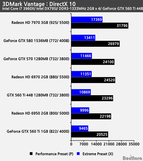 3DMark Vantage´Â DX10 ȯ°æÀ» Å×½ºÆ®Çϸç, ±×·¡ÇÈÄ«µåÀÇ ±âº» ¼º´ÉÀ» ºñ±³ÇÒ ¼ö ÀÖ´Ù. ±â°¡¹ÙÀÌÆ® ÁöÆ÷½º GTX 560 Ti 448Àº ·¹ÆÛ·±½ºº¸´Ù ¾à°£ ´õ ³ôÀº ¸Þ¸ð¸® Ŭ·°À» Àû¿ëÇØ Àü¹ÝÀûÀÎ ½ºÄھ ÁöÆ÷½º GTX 560 Ti (384)¿Í ÁöÆ÷½º GTX 570 »çÀÌ¿¡ ¹èÄ¡µÈ´Ù.