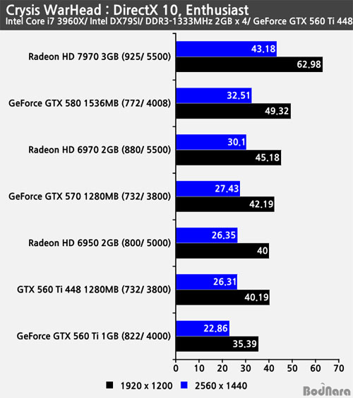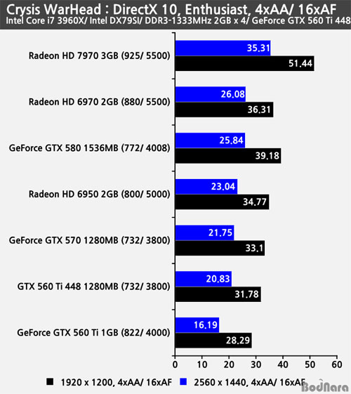 Crysis WarHead´Â DirectX 10°ú Enthusiast ±×·¡ÇÈ ¼³Á¤À» ÀÌ¿ëÇÑ °á°ú·Î ÁöÆ÷½º GTX 560 Ti 448Àº ¶óµ¥¿Â HD 6950 2GB ¹× »óÀ§ Á¦Ç°ÀÎ ÁöÆ÷½º GTX 570º¸´Ù ¾à°£ ³·Àº ¼º´ÉÀ» ³»ÁáÀ¸³ª ÁöÆ÷½º GTX 570°úÀÇ ¼º´É Â÷´Â ³ôÁö ¾Ê´Ù. ÁöÆ÷½º GTX 560 Ti (384)¿Í °íÇØ»óµµ (2560 x 1440)¿¡¼´Â °¢°¢ 15.09%, 28.66% Çâ»óµÈ ¼º´ÉÀ» Á¦°øÇß´Ù.