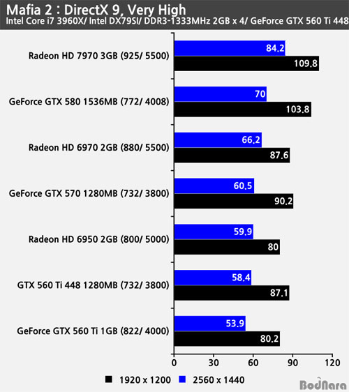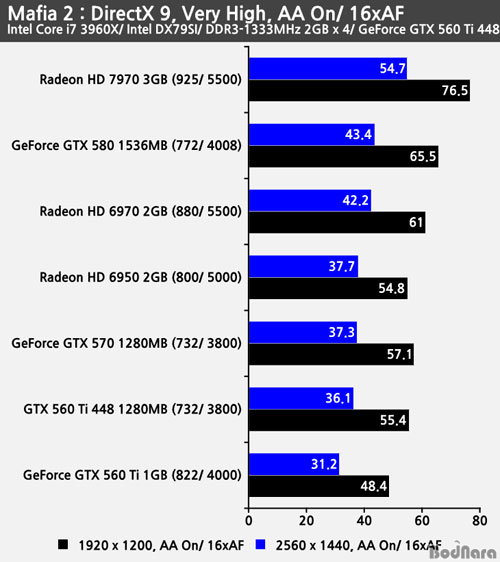 Mafia 2 °ÔÀÓÀº DirectX 9 ȯ°æ°ú Very High ±×·¡ÇÈ ¿É¼ÇÀ» Àû¿ëÇØ ÁøÇàµÇ¾úÀ¸¸ç, ÁöÆ÷½º GTX 560 Ti 448Àº ¶óµ¥¿Â HD 6950 2GB¿¡ ¾à°£ ¹Ð·ÈÀ¸³ª ½ÇÁ¦ ÇÁ·¹ÀÓ Â÷ÀÌ´Â 2fps ³»¿ÜÀÇ ¼º´ÉÀ» Á¦°øÇß´Ù.