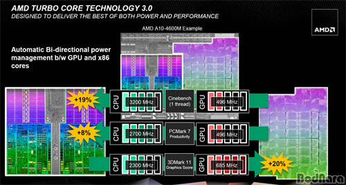 AMD Åͺ¸ ÄÚ¾î 3.0 (Turbo Core 3.0)À» Áö¿øÇÏ´Â Æ®¸®´ÏƼ APU´Â x86 ÄÚ¾î¿Í ³»Àå GPU ¸ðµÎ ÀÚµ¿À¸·Î Àü·Â °ü¸®°¡ ÀÌ·ç¾îÁø´Ù. CPU¿Í GPU°¡ ÇÊ¿äÇÑ ÀÛ¾÷¿¡ µû¶ó ºÎÇϸ¦ Á¶ÀýÇØ ÃÖÀûÀÇ Àü·ÂÀ¸·Î ¼º´ÉÀ» ³ô¿©ÁØ´Ù. ÀÌÀü ¼¼´ë ¶ó³ë APU´Â CPU Äھ TDP ¹üÀ§ ³»¿¡¼ ºÎÇÏ¿¡ µû¶ó Á¶ÀýµÇ¾ú°í GPU ÄÚ¾î´Â ÃÖ´ë Ŭ·°¿¡¼ °íÁ¤µÇ¾ú´Âµ¥ Æ®¸®´ÏƼ APU´Â CPU¿Í GPU°¡ ¸ðµÎ ºÎÇÏ¿¡ µû¶ó TDP ¹üÀ§ ³»¿¡¼ µ¿ÀÛÇÏ¸ç º¸´Ù À¯±âÀûÀ¸·Î µ¿ÀÛÇÑ´Ù.