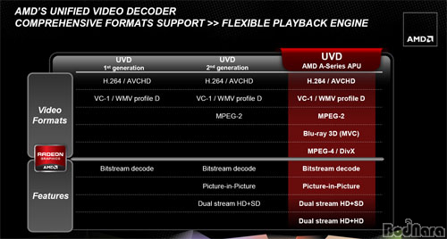 Æ®¸®´ÏƼ APUÀÇ UVD (Unified Video Decoder)´Â ¶ó³ë APU ³»À庸´Ù ¾÷±×·¹À̵åµÈ ±â´ÉÀ» Á¦°øÇÑ´Ù. Æ®¸®´ÏƼ APU¿¡ ³»ÀåµÈ UVD´Â µ¥½ºÅ©Å¾ ±×·¡ÇÈÄ«µå¿¡ žÀçµÈ °Í°ú °°Àº UVD3.0À» ³»ÀåÇØ H.264¿Í VC-1, MPEG-2, Blu-Ray 3D (MVC), MPEG-4/ DivX¸¦ ºñ·ÔÇÏ¿© ºñÆ®½ºÆ®¸² µðÄÚµå, PIP (Picture-in-Picture), ¸ÖƼ½ºÆ®¸² HD+HD Áö¿øµµ °¡´ÉÇØÁ³´Ù.