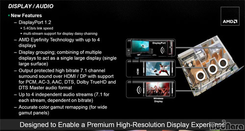 Æ®¸®´ÏƼ APU´Â ¶ó³ë APU¿Í ´Þ¸® ÃÖ´ë 4´ëÀÇ µð½ºÇ÷¹À̸¦ Áö¿øÇÏ´Â ¾ÆÀÌÇÇ´ÏÆ¼ (Eyefinity) ±â¼úÀ» Áö¿øÇϸç, µð½ºÇ÷¹ÀÌ 1.2 (DisplayPort 1.2, 5.4GB/s ¸µÅ© ½ºÇÇµå ¹× ¸ÖƼ ½ºÆ®¸² Áö¿ø)°ú HDMI 1.4a ±Ô°Ý Áö¿ø, 7.1ä³Î ¿Àµð¿À ÄÚµ¦, DTS, Dolby TrueHD¿Í DTS Master ¿Àµð¿À Æ÷¸Ë Áö¿ø, ÃÖ´ë 4°³ÀÇ µ¶¸³ ¿Àµð¿À ½ºÆ®¸²À» Áö¿øÇÑ´Ù.