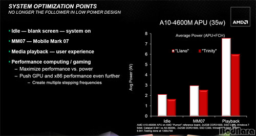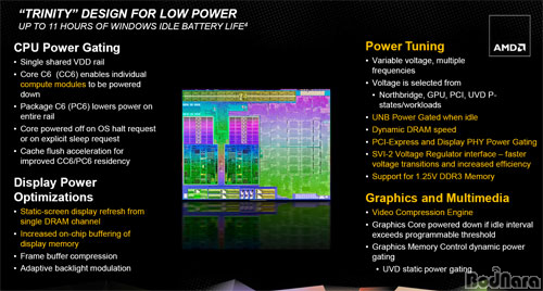 AMD 2¼¼´ë APUÀÎ Æ®¸®´ÏƼ´Â ¶ó³ë (Llano) APU¾Æ °°Àº 32nm °øÁ¤À¸·Î ¸¸µé¾îÁö³ª º¸´Ù °³¼±µÈ Àü·Â °ü¸® ±â¼úÀ» ¹ÙÅÁÀ¸·Î Àü·Â È¿À²À» ³ô¿´´Ù.