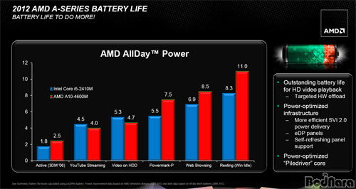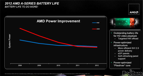 AMD Æ®¸®´ÏƼ APU´Â 32nm °øÁ¤°ú ÆÄÀϵå¶óÀ̹ö ÄÚ¾î, ¶óµ¥¿Â HD 7000 ½Ã¸®Áî ³»Àå ±×·¡ÇÈÀÇ Àü·Â ÃÖÀûÈ, 17W ¹öÀüÀÇ ÀúÀü·Â APU¸¦ Á¦°øÇØ ±âÁ¸º¸´Ù ¹èÅ͸® ¼ö¸íÀ» Çâ»óÇß´Ù. 2¼¼´ë A ½Ã¸®Áî APU¿¡¼´Â ÀÎÅÚ¿¡µµ ±ÙÁ¢ÇÑ Àü·Â Çâ»óÀÌ ÀÌ·ç¾îÁ³´Ù°í ¼Ò°³µÇ¾ú´Ù.